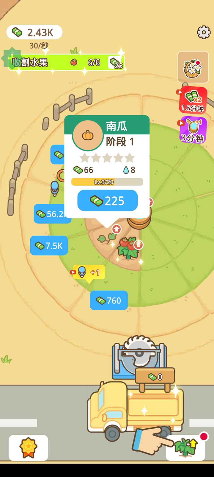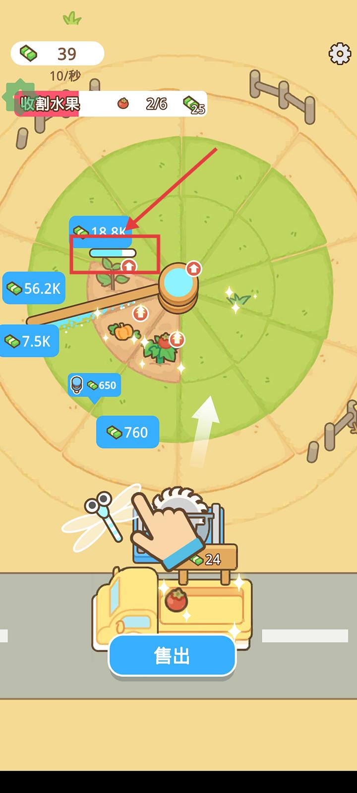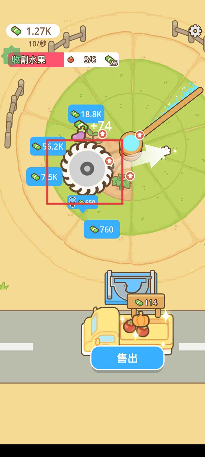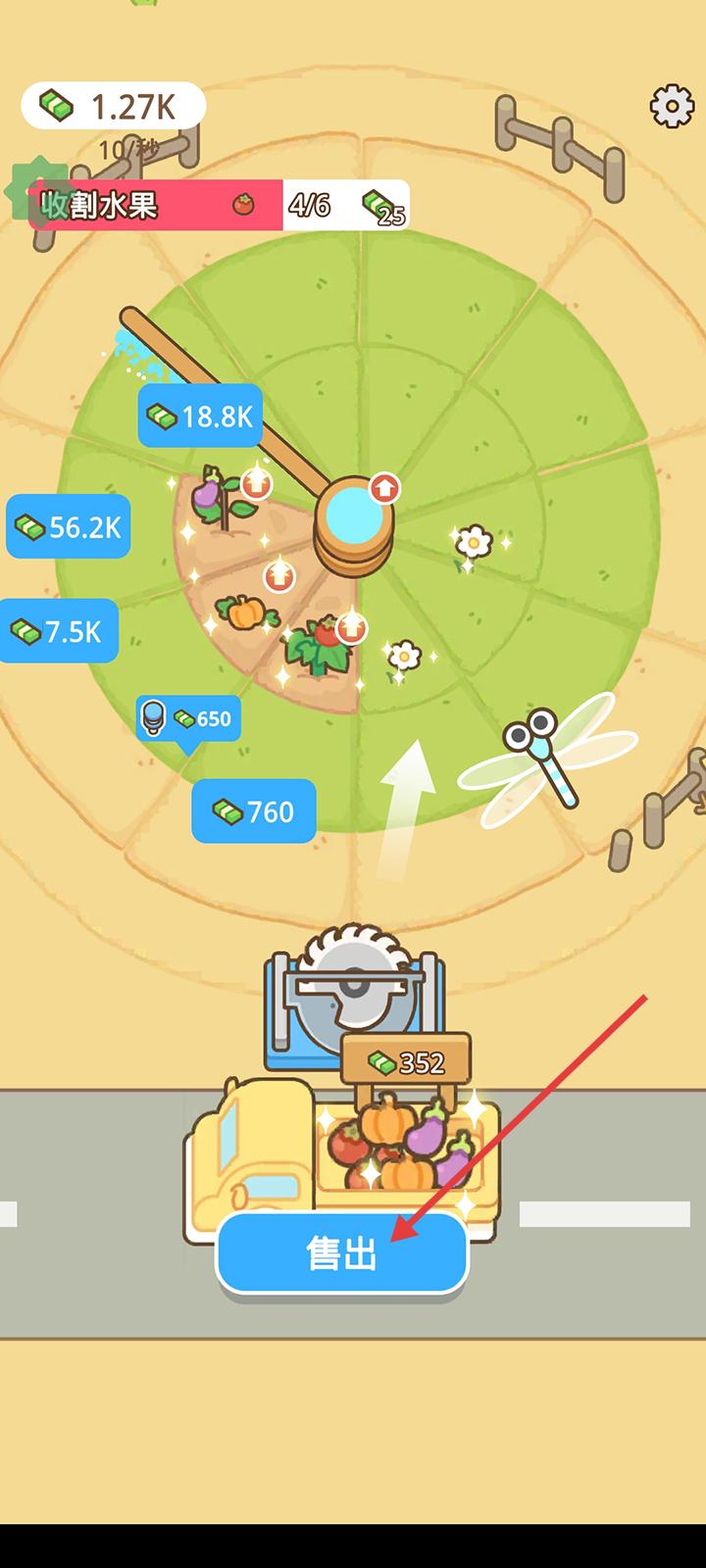 4、收割的农作物会自动到下方卡车上,点击出售即可卖掉赚钱。