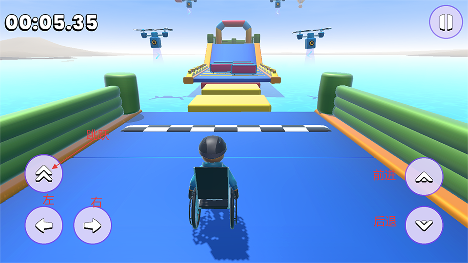 3、通过操控轮椅来躲避障碍物,直到到达终点。
