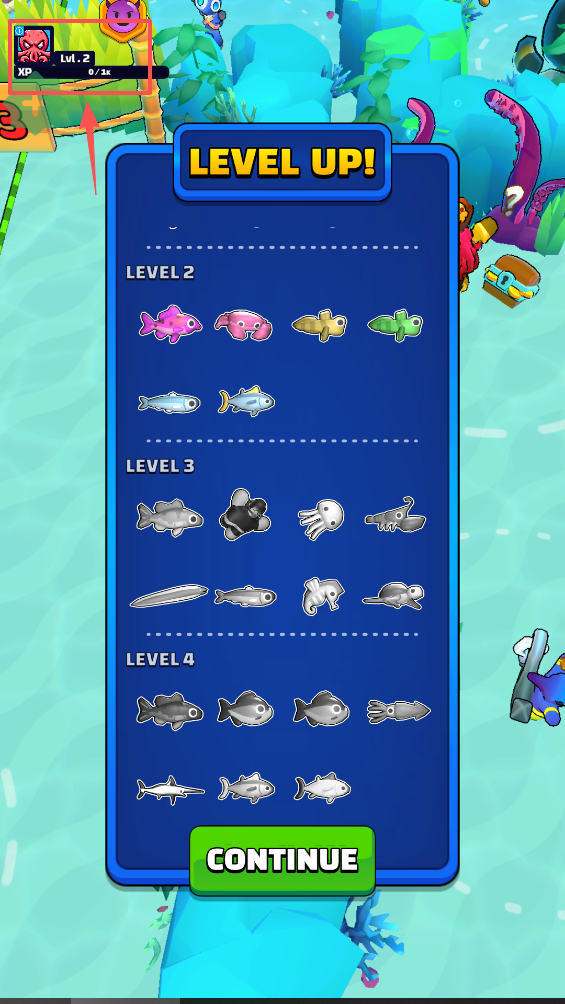 6、当章鱼等级提升后讲解锁新品种的鱼类,然后通过吞噬不断升级,最终进化成终极海洋生物吧