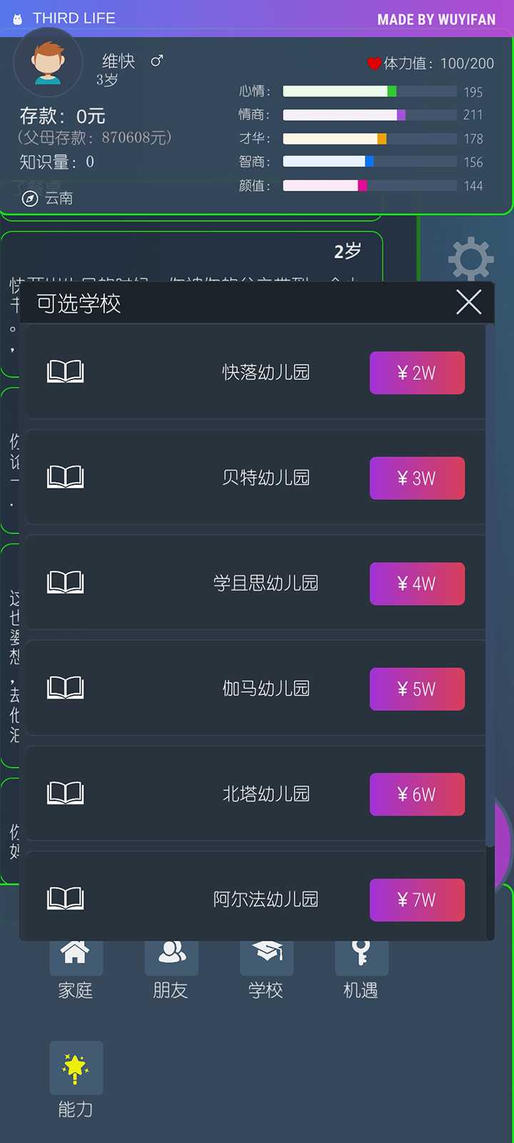 三重门是一款文字养成类模拟人生游戏,提供三条差异显著的人生赛道供玩家选择,第一重是天赋与家境俱佳的天才人生,第二重是属性中等却拥有读心术的中庸人生,第三重是先天条件极差但持有时间暂停能力的逆境人生。游戏以文字叙事推进剧情,涵盖升学、求职、社交等诸多贴近现实的人生场景,玩家在关键节点的每一次选择都会触发不同剧情分支,部分事件中还能使用对应人生的超能力,做出现实中难以实现的决策。同时玩家可查看角色存款、智商等各项属性,随时掌握人生状态,游戏操作简单且支持进度保存,能让玩家利用碎片化时间沉浸式体验不同人生的可能性。