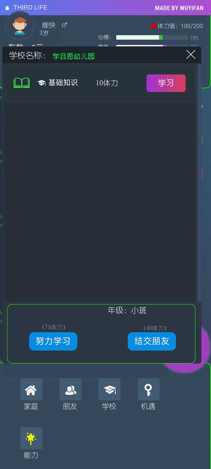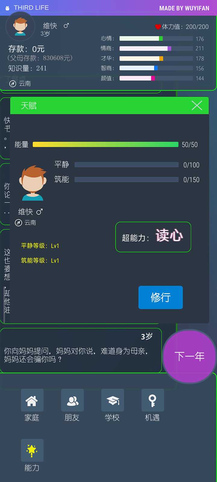 7、如果你选择了有超能力的人生,你也可以花费体力去修行,平静会增加触发超能力事件的概率,筑能可以能加你使用超能力的能量。