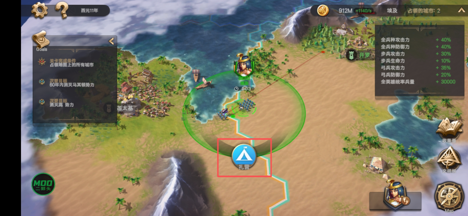 3、找到需要占领的城市指挥军队进攻,同时进攻途中选择扎营可以及时让士兵恢复