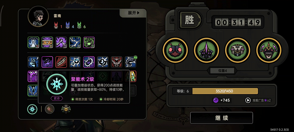 开局刷法术,一定要有(聚能术),效果如下,可以给大招充能,主要靠大招打伤害,大招有短暂的无敌效果加上打断能力,给BOSS削任性非常快,成型后可以一直按大招,其他天赋加点如下