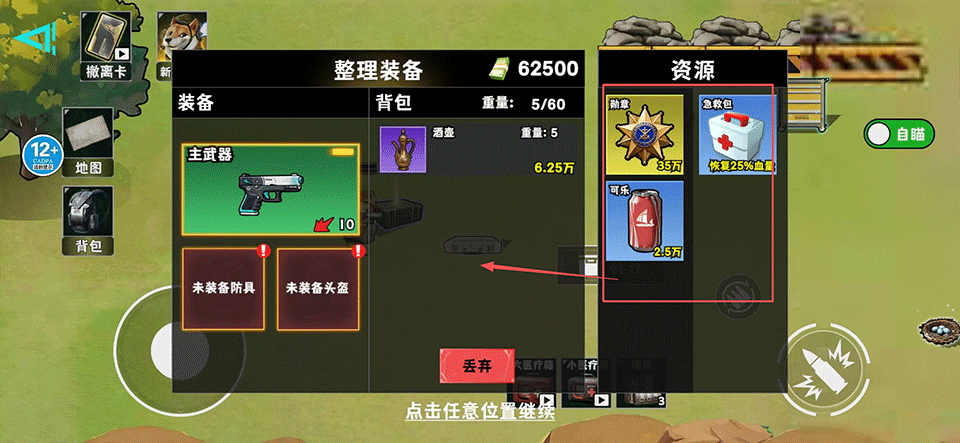 2、搜索出资源后,点击右边的资源将其收获到自己的背包中,因背包容量有限,所以在搜索途中尽量将价值更高的资源放入背包