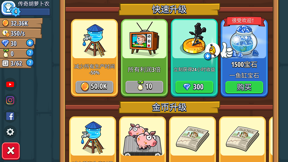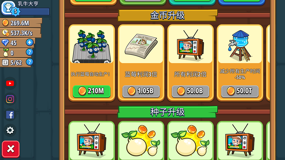 其次,这个游戏并不是单纯地种东西卖东西,而是类似于点杀泰坦一样,有类似于转生系统的如市集(点击左下方的绿标,第六块土地开启后就有),在转生过后就把种地作物家畜转换为了种子,种子可以提高利润的获取量,具体数值可以点旁边的?来看。