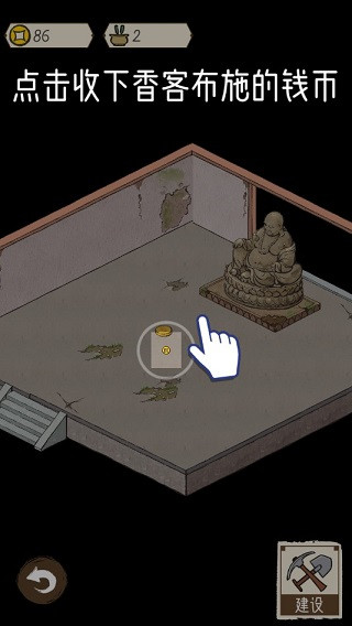 5、回到天王殿内部,此刻将会有香客前来拜佛,在香客离开后点击收下香客布施的钱币即可为寺庙增添香火钱,这些对于寺庙的重修有着至关重要的作用;