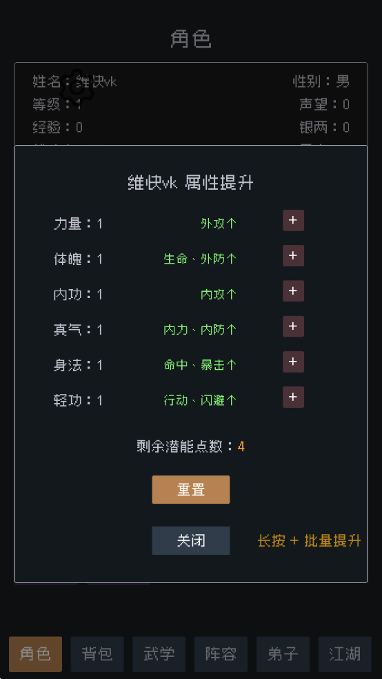 3、作为初入江湖的小菜鸟,你刚开始有几个属性点可以自由分配;