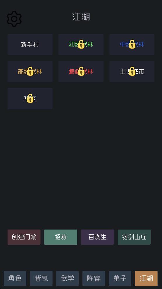 创建门派:自定义门派名称、标志、武学风格,招募弟子并分配任务。