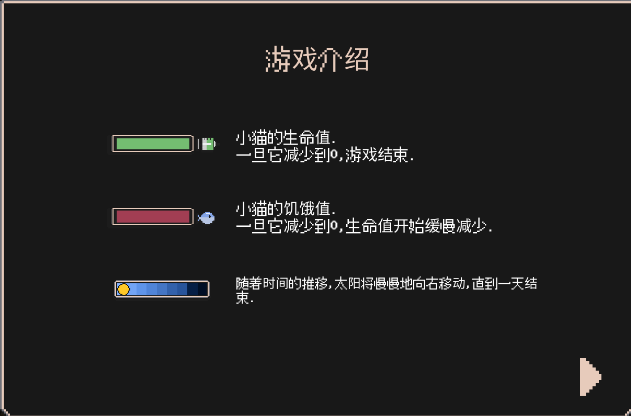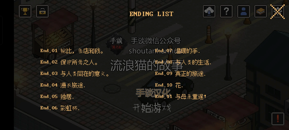 流浪猫的故事中文版是一款以猫咪视角展开的像素风治愈系生存冒险手游,并此版本已由手谈汉化组完成汉化,支持简体中文语言。游戏中玩家将扮演一只在街头流浪的小猫咪,以猫咪的视角与不同的NPC进行对话交流,在经历了13天之后,你会长成一只大猫。游戏玩法主要为探索收集与资源管理,你不仅需要通过翻垃圾桶来寻找食物、还要躲城管与野狗,以及应对饥饿、寒冷与疾病。同时游戏还设有多名性格各异的NPC,如鱼店老板、黑猫老大等,玩家通过互动和赠送物品可解锁支线与关键线索,并触发11种不同结局。