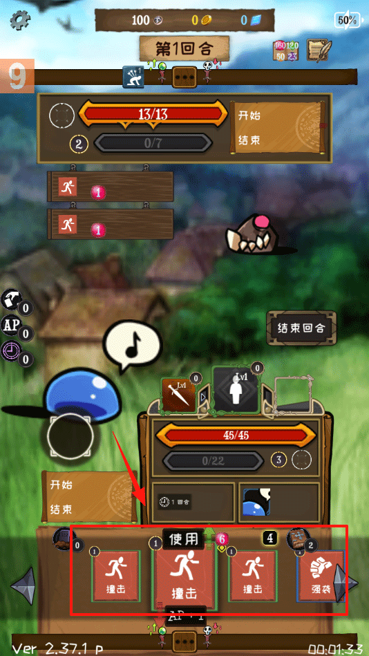5、这是属性面板,有血条、ap技能、防御属性等,然后我们需要同时使用下面的各种技能攻击敌人,我方进攻次数消耗完后点击结束回合,轮到敌方进攻