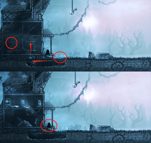 3、流浪者视角。往左走到房子前松动的木板上,站在木板上跳几次,破坏木板,从木板下的坑道爬进房子,获得镰刀。然后推开房门出去,砸死门外的黑色怪物。