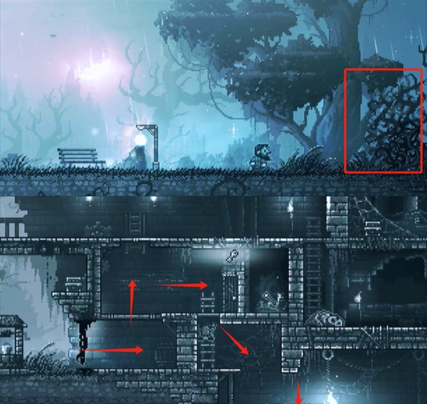 4、往右走,砍断挡路的藤蔓,继续往右,进入城堡后往右下的火盆方向走下去。