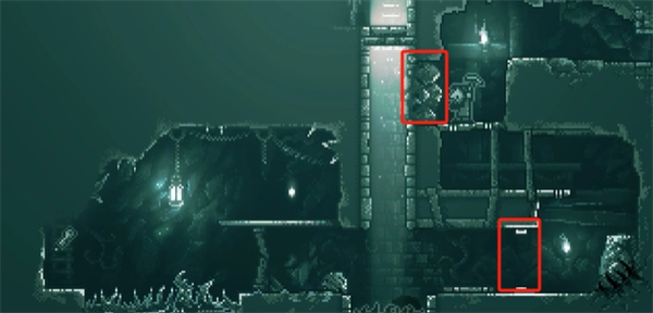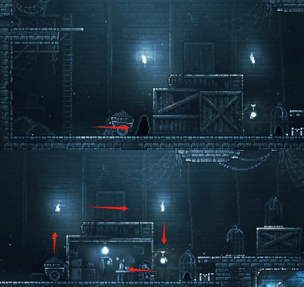 7、流浪者视角。按下黑色怪物左边的按钮,3个铁笼升上去,爬上铁笼往右走,然后爬最右边的梯子上去。