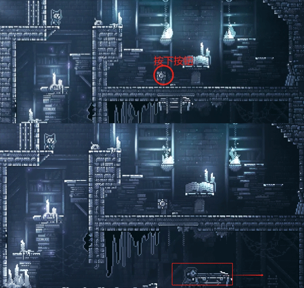8、如图,按下书架下的按钮,放下下面的箱子,然后把箱子往右推,使箱子掉落下去。