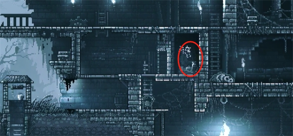 15、遭遇怪物后,迅速返回下图的地方,等怪物跳过右边后,迅速爬左边的梯子,往左跑,跑到左边的尽头后往上爬,爬到最高层后往右跑,直到怪物掉进尖刺坑里。