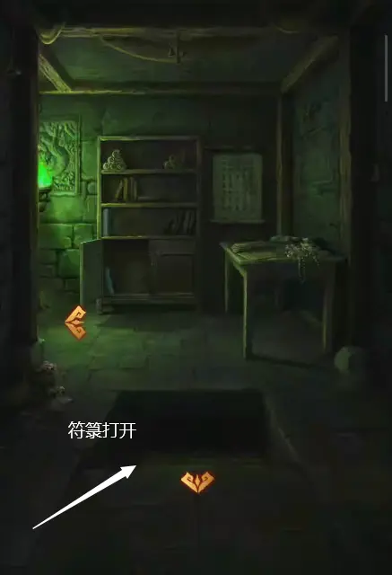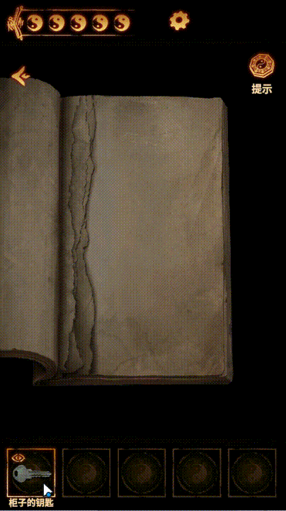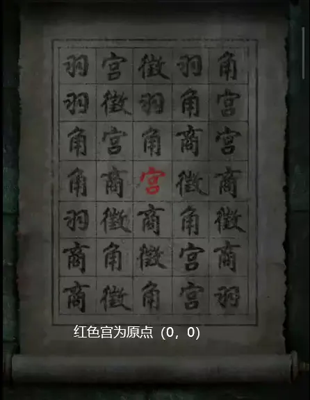 5、根据日记加载的顺序调整墓室左边柜子上的物品,箱子打开,获得【古旧钥匙】,使用钥匙打开走廊的柜门,获得【香火】,还有一本书,第二页有坐标系,根据坐标系和墙上的字得出顺序为“宫羽商徽角宫商羽”,以这个顺序敲击编钟,获得【符箓】。