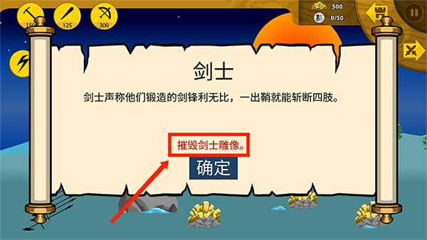 3、要保护自己的雕像就需要有弓箭手和剑士,点击此按钮以及有足够的金矿即可召唤。