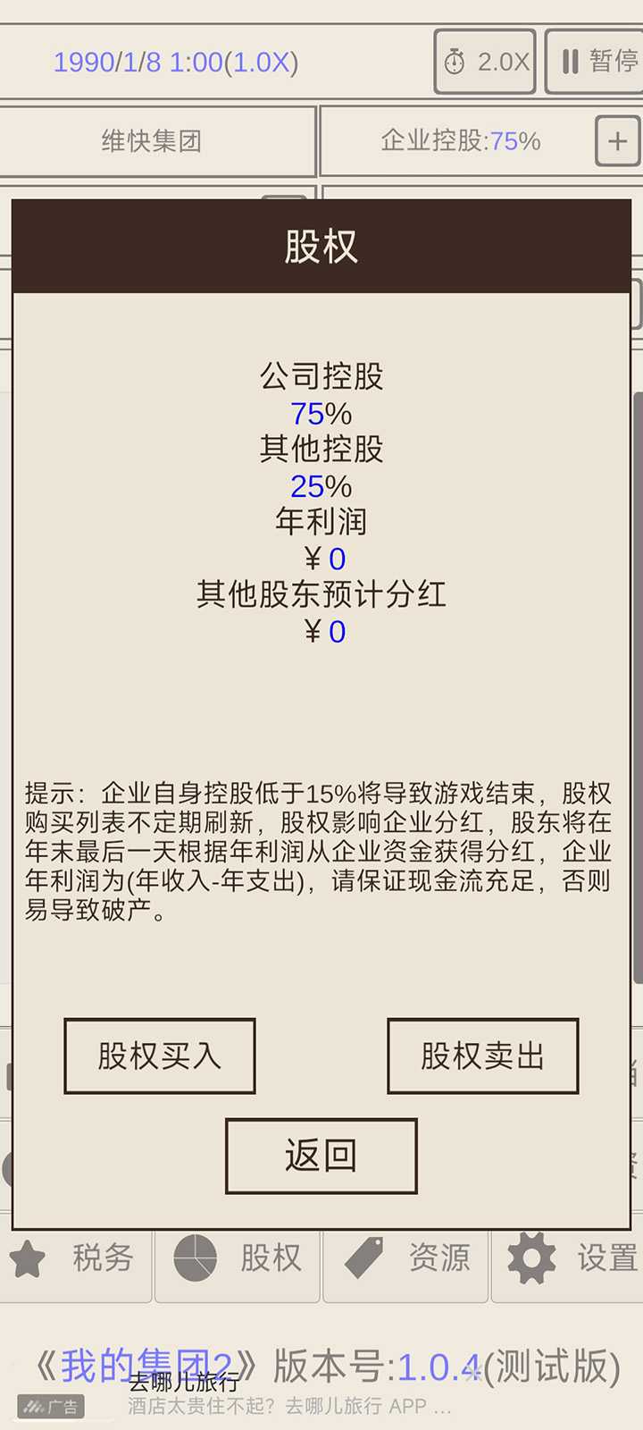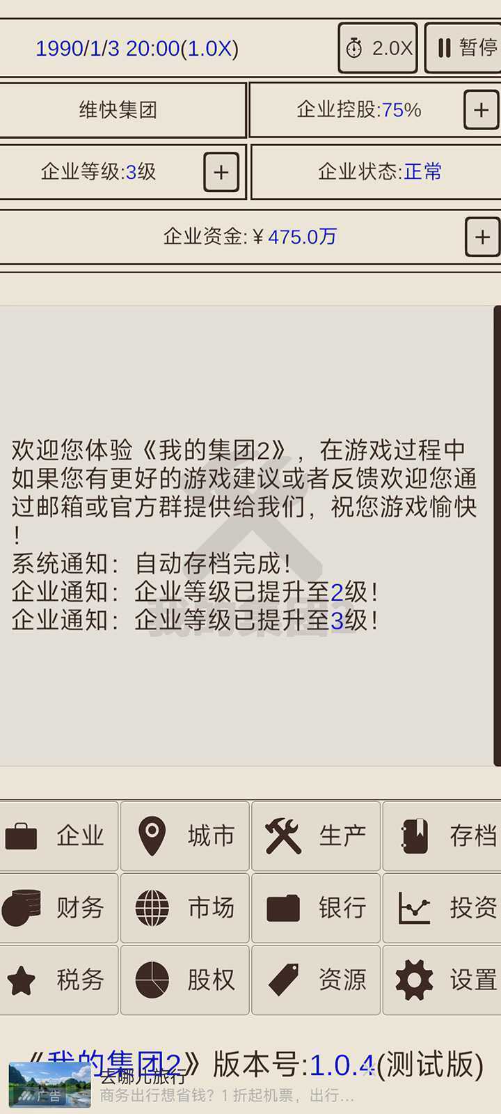 我的集团2是一款单机文字类的模拟经营游戏。玩家需扮演企业家,通过不同的方式扩大企业规模,且游戏新增了股权玩法,玩家可通过买卖股票扩大影响力或吸引投资者。除此之外,游戏以模拟现实生活为主题,玩家需面对经济危机、物价飙升等问题,合理分配资金,带领企业度过危机。喜欢商战和模拟管理主题的玩家千万不要错过。