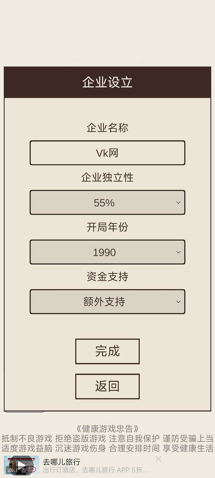 建议55%股份开局,因为这会获得更多资金,部分玩家可能会选100%,最终导致资金极度紧张,打个比方,55%开局相当于另外45%换来了融资,100%开局就是自己独资。