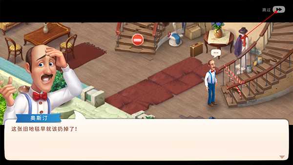 1、打开梦幻家园手游,登入后会先经历一段剧情介绍,玩家如果不想看可以点击右上角的“跳过”按钮;