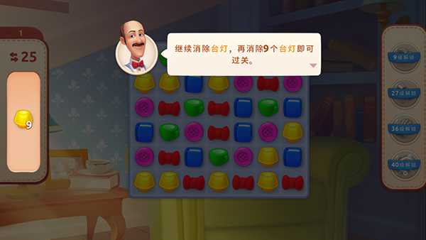 3、这一关的要求就是需要消除9个台灯,所以你还需要继续消除台灯才可以哦;