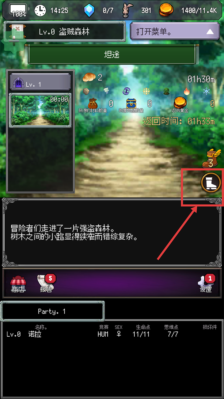 5、开始探索后点击右侧的鞋子按钮来带领冒险者前进,当完成探索后冒险家就会原路返回。