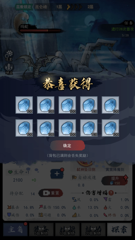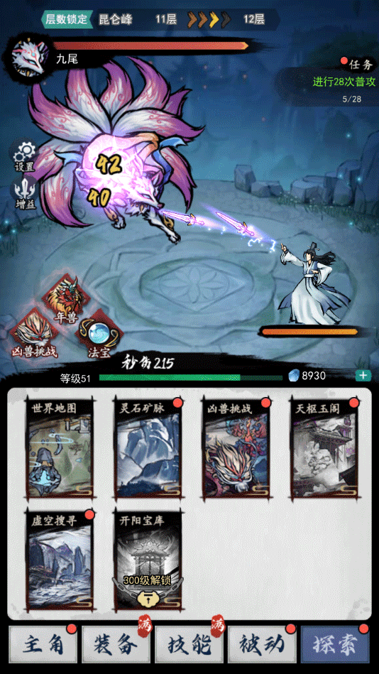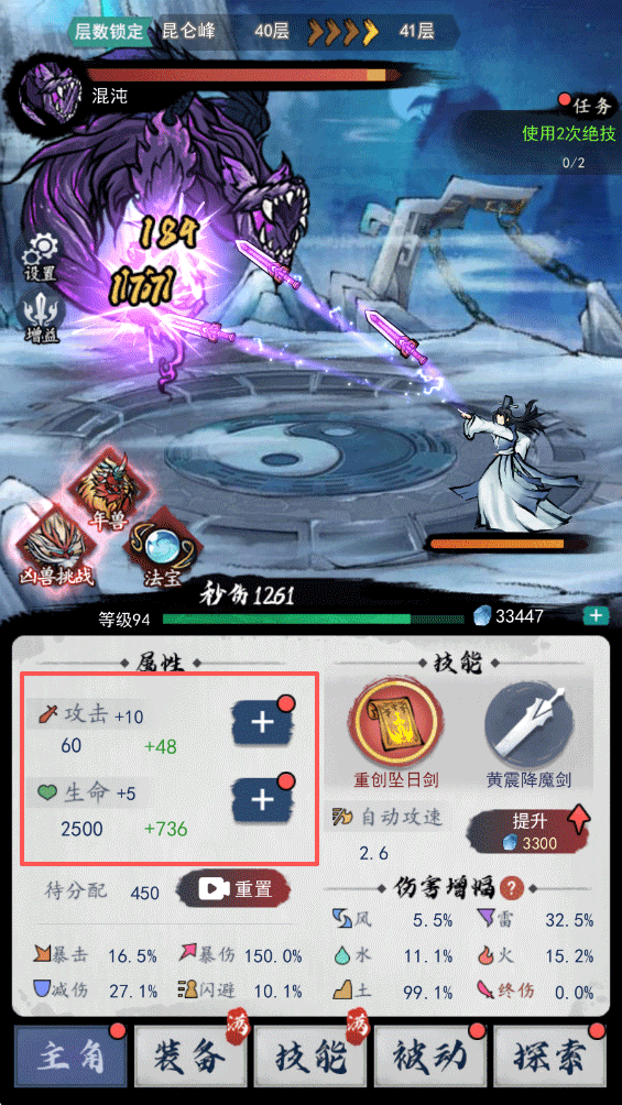 闪避凑够95以后装备副词条优先生命减伤,武器优先攻速避免攻击属性,打凶兽挑战里的九尾狐,BOSS快死了退出再打即可。