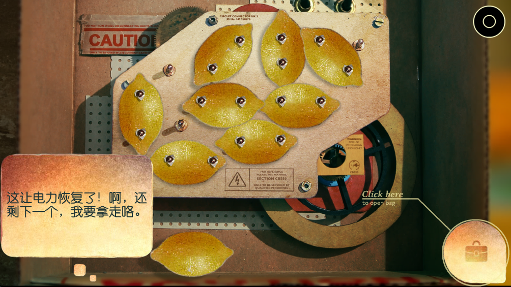 4、进入大门后,就可以在城门入口进行探索。首先前往红框处这里,有一个配电箱,需要使用道具进行解谜(连线)。进去的房间里,可以看到房间里有柠檬树,上面全是柠檬,点击全部收集。同时边上的黄框有电路图(就是用在外面的配电箱),查阅一下后到外面的配电箱。