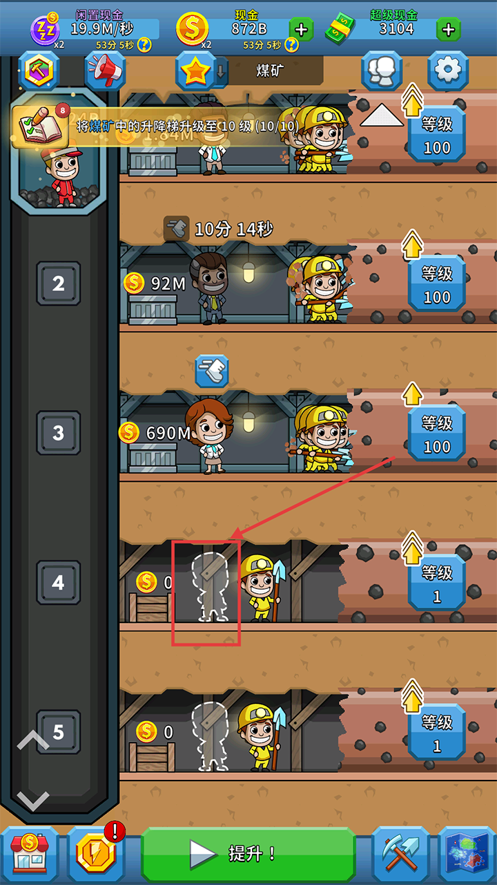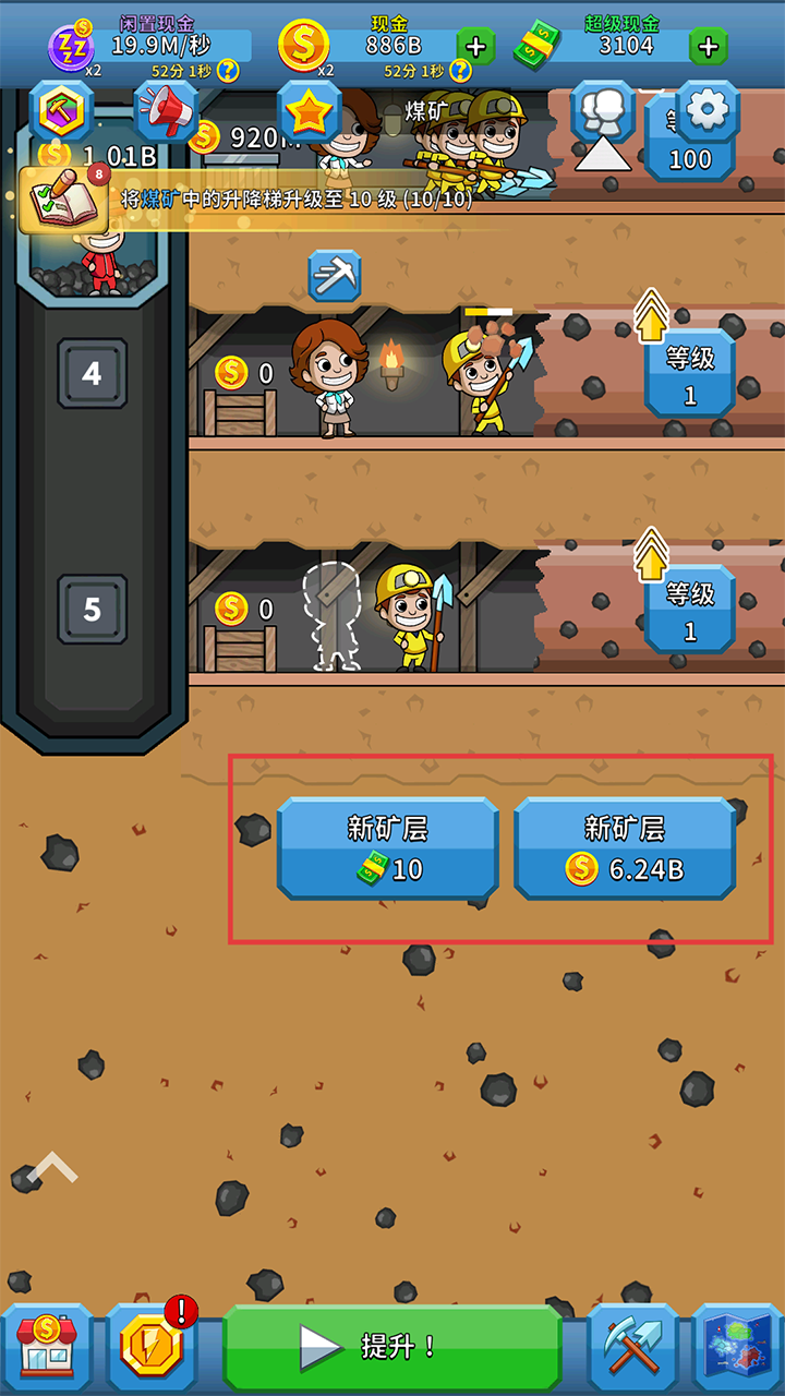 6、最后有新矿层可以开时,重复上述步骤,赚钱速度秒升。