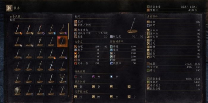 假设我们是骑士出身,那么长剑就是我们的第一把武器。大家知道黑魂素有越朴素的武器越牛逼的说法,最朴素的长剑便是直剑三幻神之一。长剑的耗精和阔剑差不多,比洛直低,基础面板高于洛直,物理质变面板是比洛直高的。直剑我都推荐敏号使用,锋利质变,但是锋利宝石并不多,前期能搞到的就两个,一个在颓旧桥端,一个在地下墓地。
