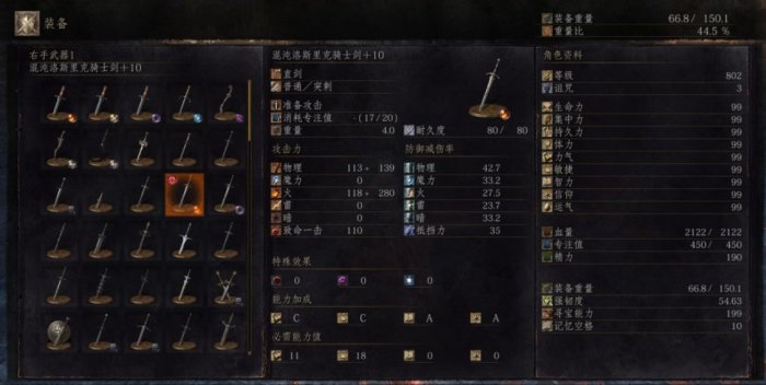 拿这个的骑士会掉落,众所周知有一个洛骑会把守高墙边塔的火,所以就把它算到这个地方。洛直的长度很长,比长剑还略长,但是耗精也是直剑最高一档。它最优秀的地方在于属性质变的面板是直剑里最高的,并且有着110的处决倍率,高颜值高强度,相当推荐。